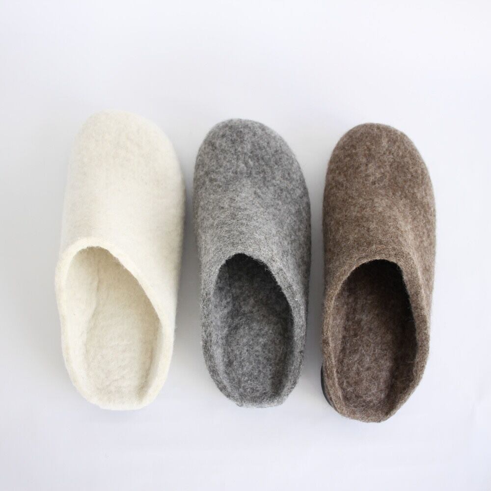 世界中に数ある中から毛玉になりにくく肌触りの良い羊毛を厳選し、水とオリーブローレル石鹸のみでフェルト化させた「ルームシューズ」
