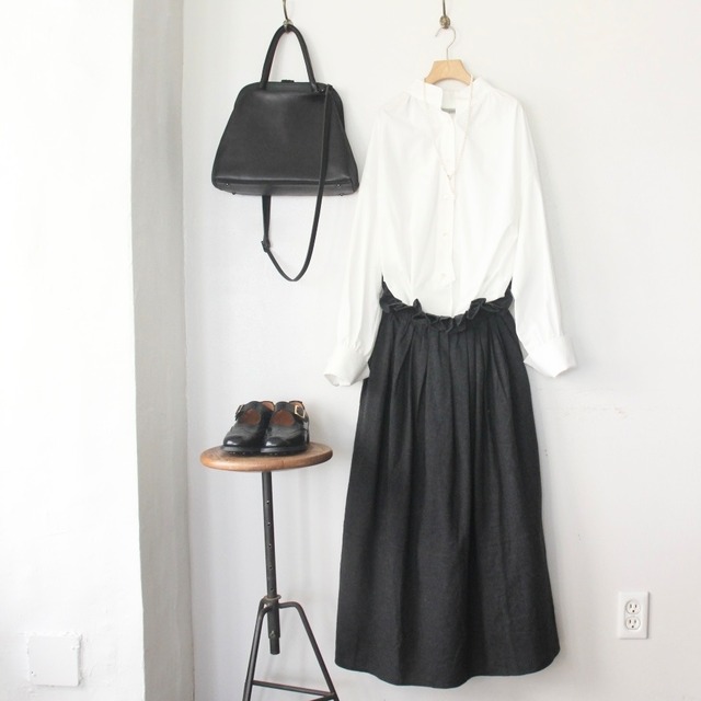 ナチュラルな雰囲気になりすぎないよう、生地の厚さや量、裏地の素材にまでこだわり、外国の紳士服を彷彿とさせるスタイリッシュなギャザースカートです